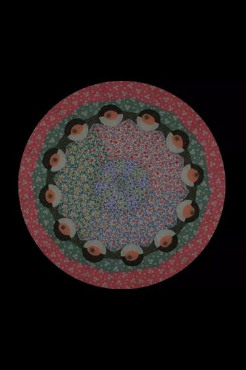 Modeled after a traditional medallion quilt pattern - the Dresden Plate - Swamped (eye roll) uses calico prints cut and stitched so that when rotated and photographed, it becomes animated - a looping illusion of life.