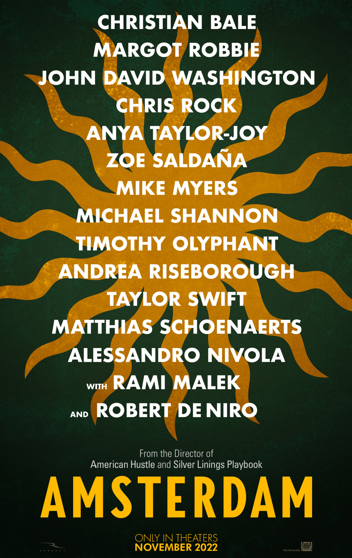 Alongside the veterans, there is a batch of actors who make their Russell debuts for the sprawling ensemble of ‘Amsterdam’. Alessandro Nivola, Andrea Riseborough, Anya Taylor-Joy, Matthias Schoenaerts, Timothy Olyphant, Michael Shannon, Mike Myers, Zoe Saldaña, Rami Malek and even Taylor Swift showed up for this one (we’re hoping the latter had a good time shooting the movie, or there will be a very critical, well-written song in Russell’s future).